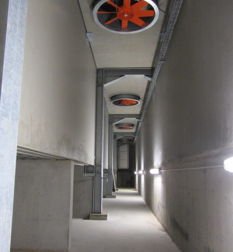 相邻两行木箱中间留出0.5m宽的空间形成风道,风道上方由牧易充气气囊覆盖。风道尾部开口由垂直气囊或盖板封堵。轴流风机将气流鼓入风道内部,而后气流水平经过木箱内部后排出。