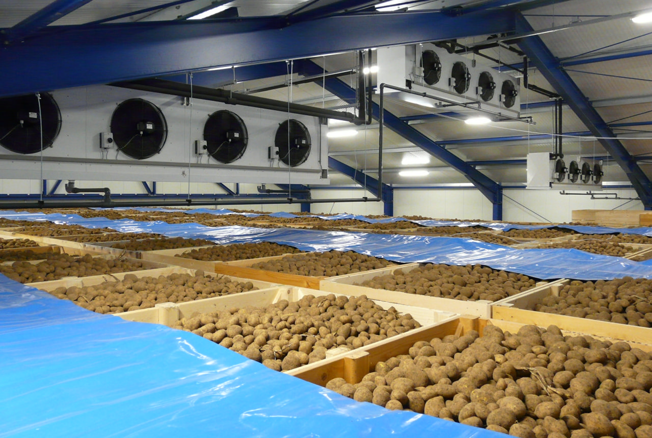 堆垛高度可达4至5米,是一种储存期较长的仓储形式,散装及袋装仓储可以带来高质量的产品与较低廉的仓储成本。无论您储存的是砂质土壤中收获的马铃薯或者是潮湿气候下的洋葱,牧易仓储可为您提供完整与正确的仓储通风系统。整套系统加热,机械制冷,加湿系统可以根据气候条件不同而灵活配置。